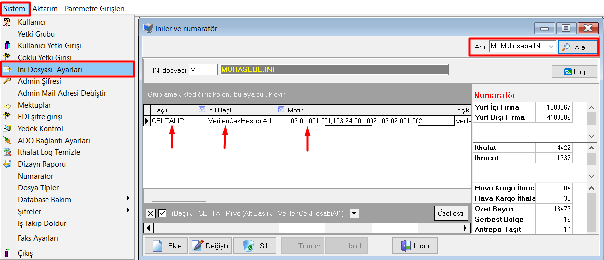 Evrim Haber > Diğer > Ussers > Sistem > Inı Dosyası Ayarları > M : Muhasebe.INI - CEKTAKIP - VerilenCekHesabiAt1 satırının Metin kolonuna