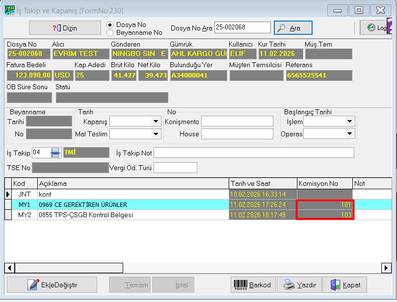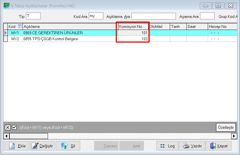 Komisyon No alanına muhasebe sistemi > veri girişi > müşteri komisyon girişi ekranında Her belge için komisyon ekleyip eklenen komisyonların numarasını İş takip ekranına tanımlanması gerekmektedir.