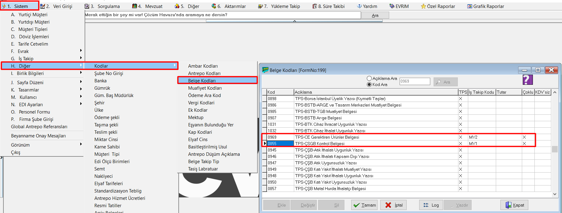 Edi belgede kullanılan belge için beyannamenin iş takibine kodun otomatik atması için 1-) Sistem > diğer > kodlar > belge kodları ekranından 'iş takip kodu' alanına ilgili iş takip kodu tanımlaması yapılmalıdır. Örneğin Belge kodu ekranı : 2-) Sistem ...