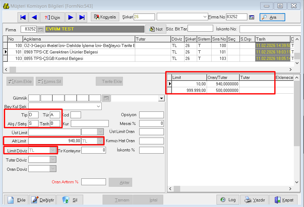 Belgeler için açtığınız her komisyona aşağıdaki gibi tanımlama yapılması gerekmektedir.