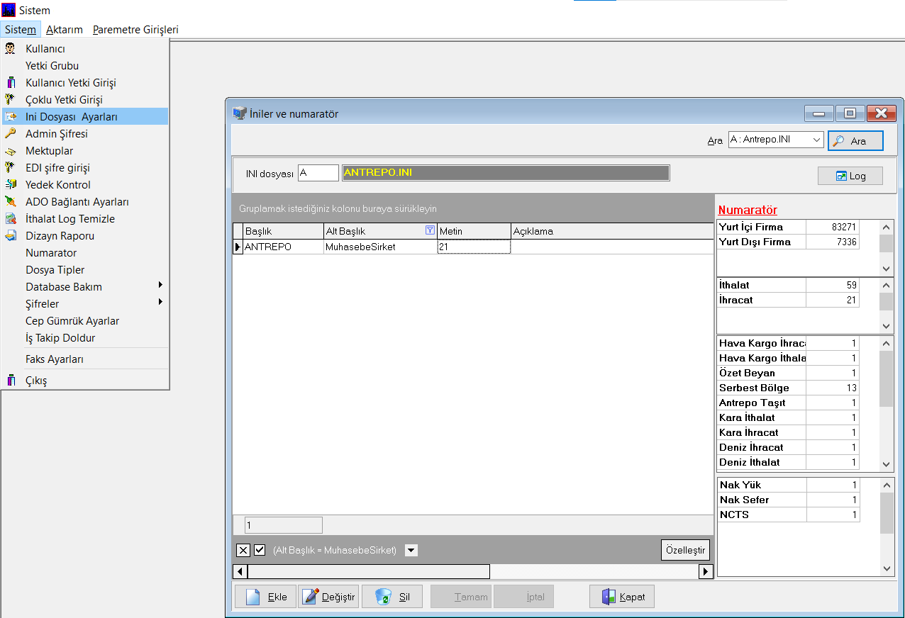 Sistem > İni dosyası ayarları > Antrepo.ini başlığında alt başlık MuhasebeSirket Metin alanı güncellenir. Program kapatılıp açılarak yeni şirket aktif olur.