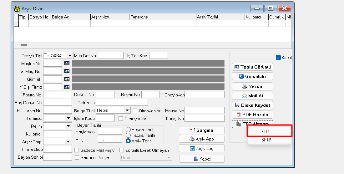Arşiv dizin ekranında FTP Aktarımı nasıl yapılır ?