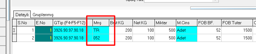 Örneğin, Menşei alanında “052” yazılması gerekirken “TR” yazıldığında bu hata oluşmaktadır. Bu durumda dosyada “Değiştir” seçeneği kullanılarak Menşei alanına doğru bilgi girilmelidir.