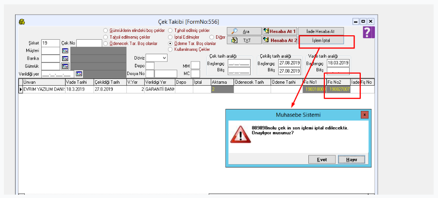 Çek girişinden otomatik oluşmuş bir fiş kaydını silmek için, Muhasebe Sistemi > Diğer > Çek Takibi ekranından İşlem İptal butonuna tıklanır. Oluşan fiş numarası geri çekilir ve fiş girişinde ilgili kayıt aratıldığında fiş silinmiş olacaktır.