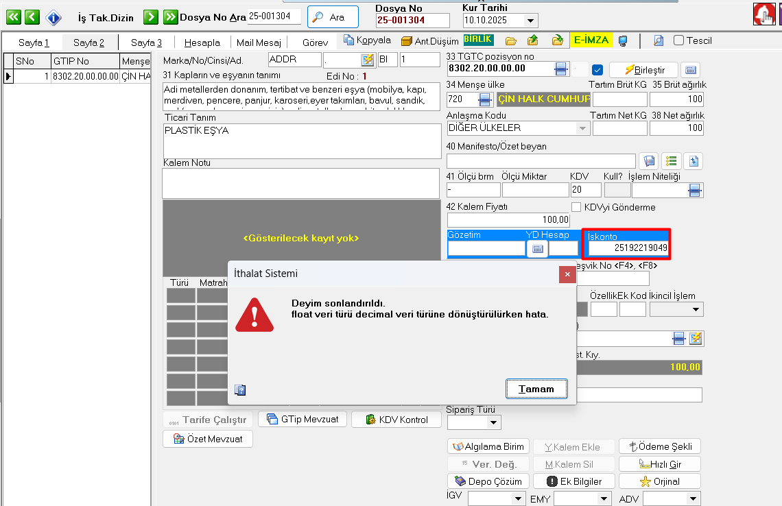 Örnek : Aşağıdaki örnekte iskonto alanına yanlış tutarda bir değer girildiği için hata vermektedir.