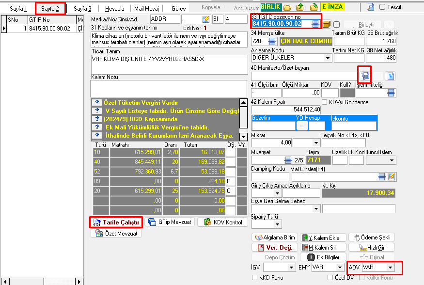Edi belgede 0300 menşe şehadetnamesine Y yazıldığı için sistem ADV kutucuğunu VAR olarak işaretlemektedir. Bu durumda ise GY 38. kapsamında tarifeye tanımlı en yüksek vergi oranı üzerinden hesaplama yapılmaktadır. Bu yapının doğru çalışabilmesi adına damping kodu alanında ' # ' ile yazılmış kodları program otomatik olarak temizlemektedir. Sistemin vermiş olduğu uyarıyı dikkate almadan, damping vergisini kontrol ederek işleminize devam edebilirsiniz.