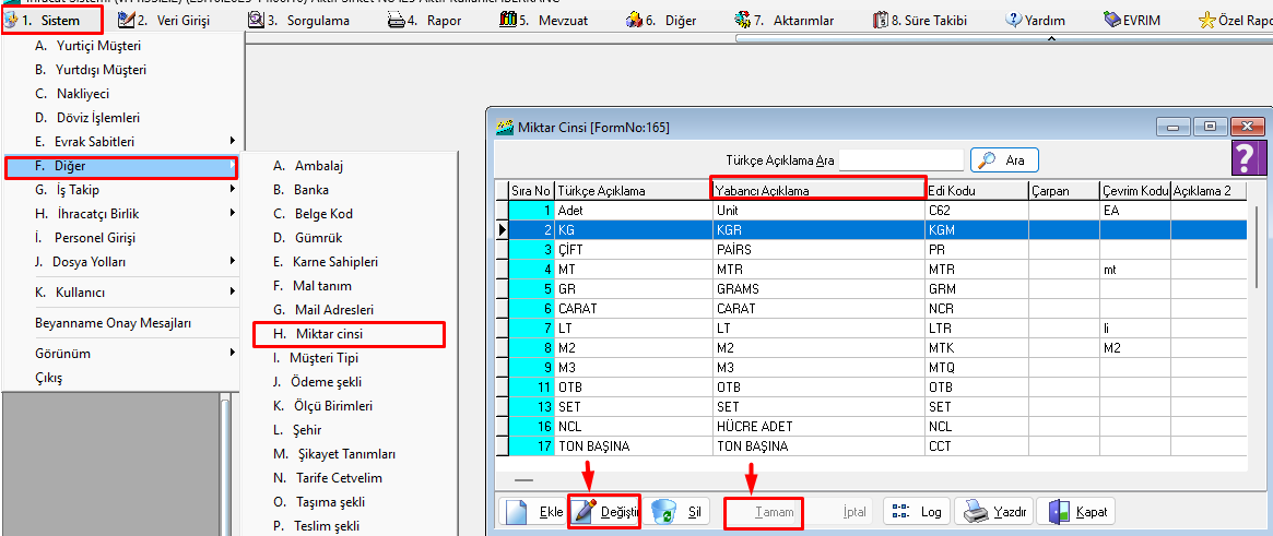 1.Sistem > F. Diğer > H. Miktar cinsi   ekranından ilgili miktar cinsi bulunarak Değiştir butonuyla Yabancı Açıklama alanı düzeltilerek Tamam butonuna tıklanarak kaydedilir.