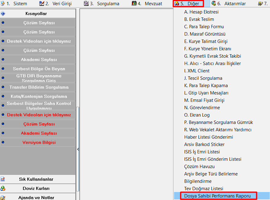İthalat ve ihracat uygulamalarında Diğer menüsü altında "Dosya Sahibi Performans Raporu" başlığında yer almaktadır.