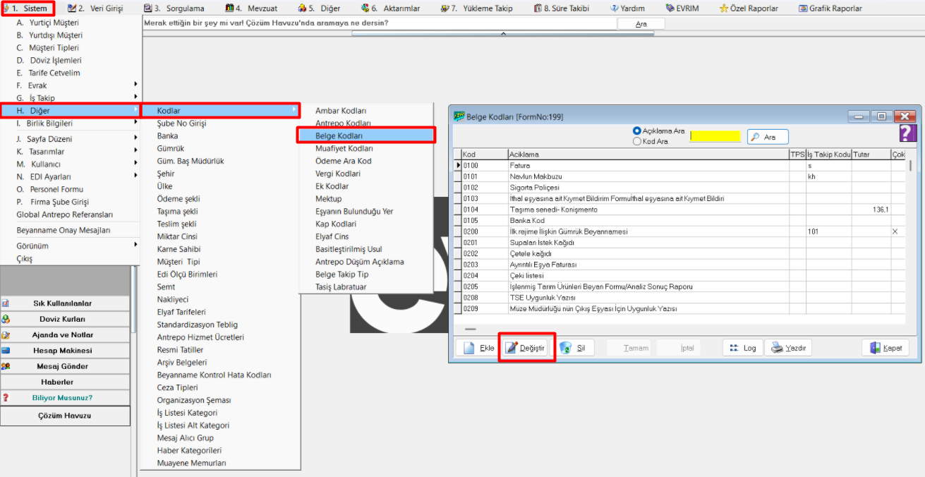 Edi belge ekranında belgenin açıklaması hatalı görünüyorsa İthalat / İhracat modülü 1. Sistem > H. Diğer > Kodlar > Belge kodları ekranında Değiştir > İlgili belgenin açıklaması düzeltildikten sonra Tamam butonuna tıklanarak kaydedilir.
