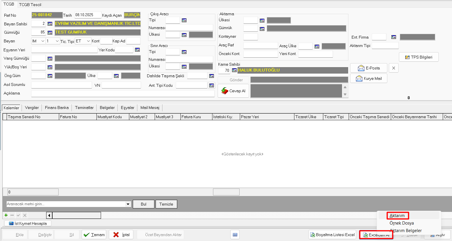 Özet Beyan sistemi > E - Ticaret > TCGB dosyanızdaki bilgileri oluşturduktan sonra kalem bilgileriniz için ekte yer alan örnek ETGB excelini doldurarak Excelden Al - Aktarım seçeneği ile aktarım sağlayabilirsiniz.