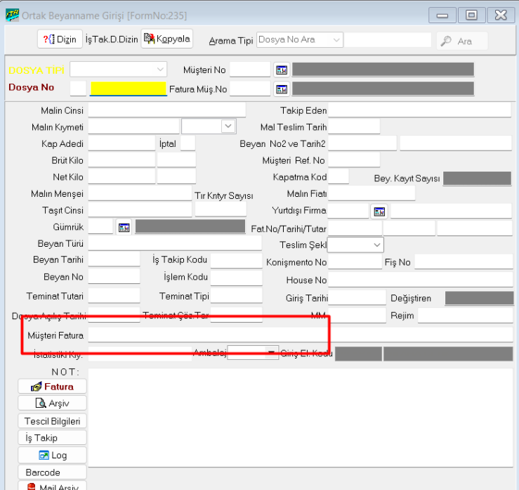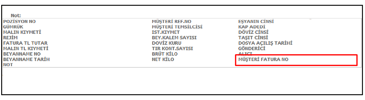 Fatura görüntüsünün alt alanında bulunan "Müşteri Fatura No" alanı İthalat sistemi 2. Veri Girişi > J. Ortak Beyanname Girişi ve İhracat sistemi 2. Veri girişi > S. Ortak Beyanname Girişi ekranında bulunan Müşteri Fatura alanından çekmektedir.