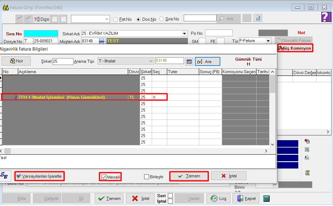 Fatura girişinde dosya için mesaili işaretleyip varsayılanları işaretle yapılmıştır.