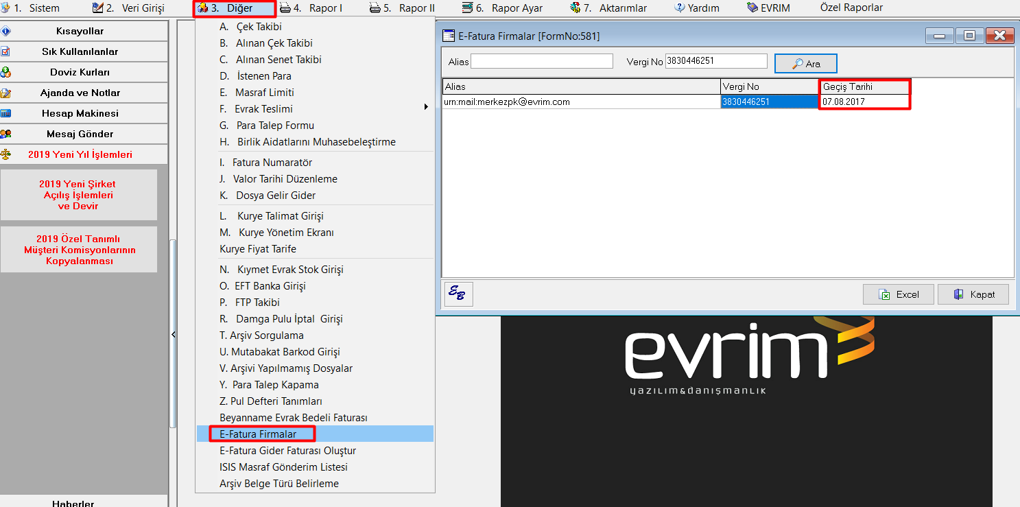 Programımızda sorgulamak için diğer > E fatura firmalar ekranından vkn ile sorgulama yapabilirsiniz.