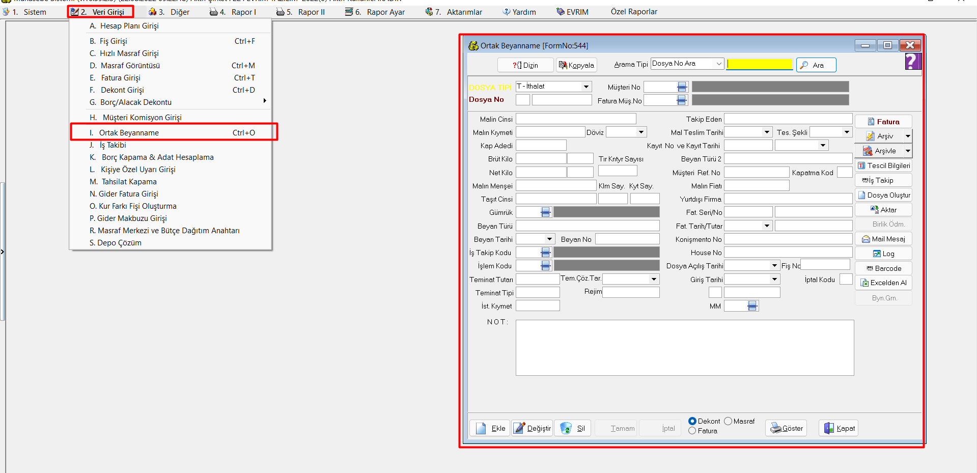 İthalat Sistemi \ Veri Girişi \ Ortak Beyanname alanından ise ithalat için ortak beyanname penceresine ulaşabilirsininiz.