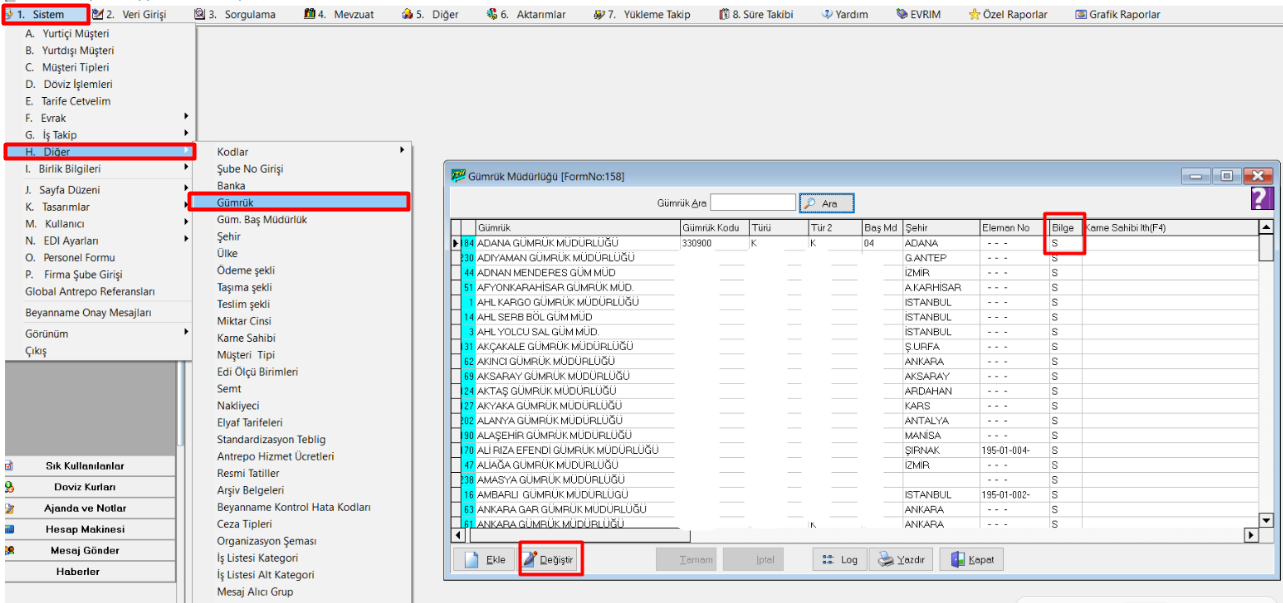 1. Sistem / H. Diğer / Gümrük tablosunda hata gelen gümrük seçilip