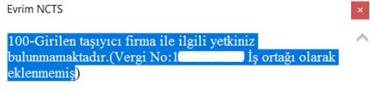 Ncts sistemlerinde girilen taşıyıcı firma ile ilgili yetkiniz bulunmamaktadır. İş ortağı olarak eklenmemiş hatası Und servislerinden dönmektedir.