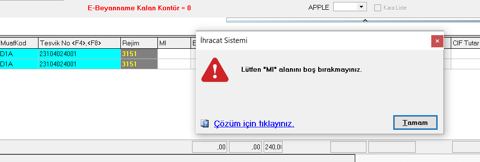 Beyannamenin ana rejimi 1040 olup kalemlerde Türk menşeli kalem var ise ve bu kalem için KIHR yazılmamış ise sistem hata yapılmasını önlemek adına uyarı verecektir.