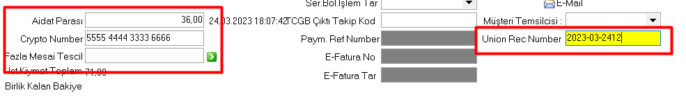 Diğer formlar ekranında Aidat parası, Unıon Rec Number ve Crypto Number bilgisi dolacaktır.