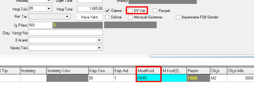 3-) Kalemlerdeki MuafKod & M.Kod(2) alanlarında KIHR varsa hesaplanmaktadır. Bu aşamada damga vergisini sıfırlayacak muafiyet kodu girilebilir veya DV yok işaretlenebilir. İşlemlere müşavir onayı ile devam edilmelidir.
