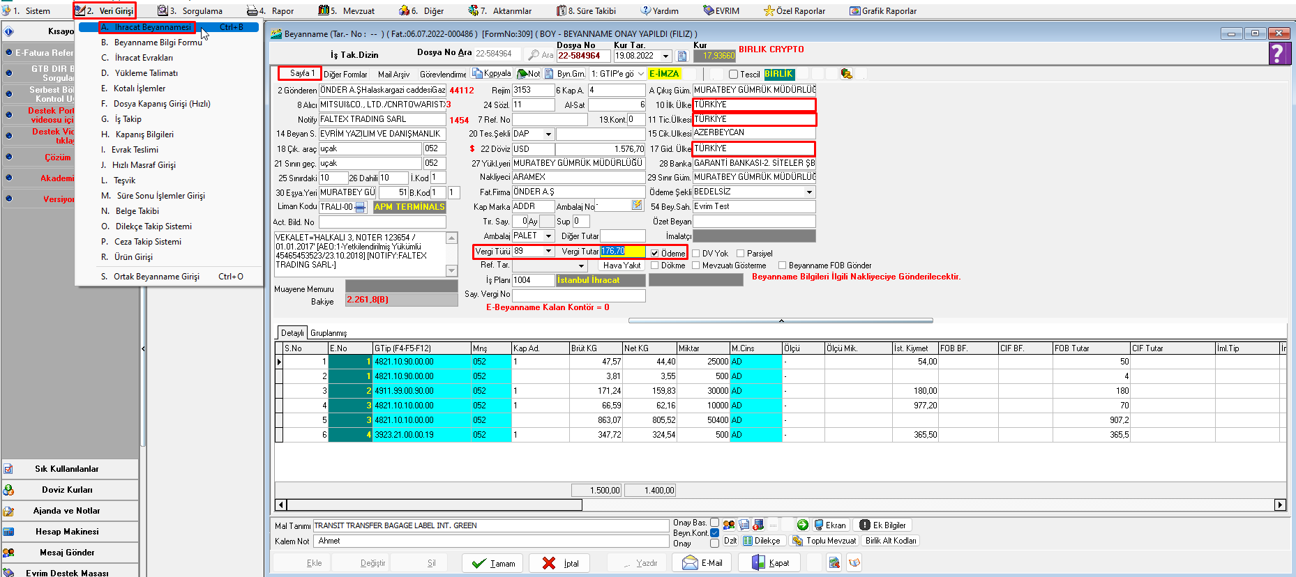 İhracat Modülü > Veri Girişi > İhracat Beyannamesi > Sayfa 1'de işlemler gerçekleşir ise görseli aşağıdaki gibidir. İhracat Beyannamesinde, İlk Ülke ya da Ticaret Ülkesi Türkiye ise damga vergisi hesaplanmaktadır. Beyannamenin ana sayfasındaki ödeme ...