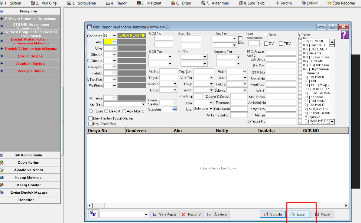Sorgulama yaptıktan sonra ekrana gelen raporu Excel Butonuna tıklayarak excele aktarabilirsiniz.