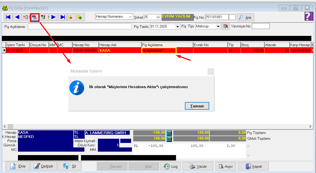 Fiş girişinde Karşı Hesaba Aktar butonuna bastığınızda gelen '' İlk olarak "Müşterinin Hesabına Aktar"ı çalıştırmalısınız '' uyarısının sebebi Fiş açıklamasına girilen '' * '' karakterinden kaynaklanmaktadır. Fiş Açıklama alanındaki ' * ' karakterini sildikten sonra tekrar Karşı Hesaba Aktar butonuna basarak işlemlerinize devam edebilirsiniz.