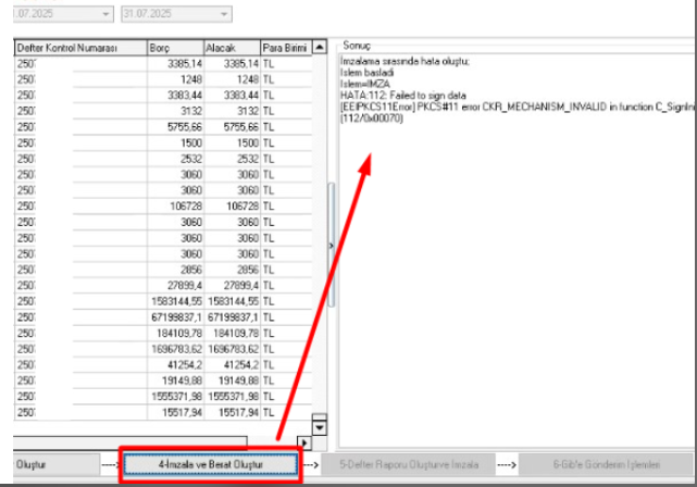 E-Defter 4. aşamada gelen görseldeki imzalama hatası için ; Aşağıdaki linkten bilgisayar ve kart bilgileri seçildikten sonra Sürücüleri Göster butonuna tıklanır. Açılan sayfada '' Akıllı Kart Sürücüsü ".msi" paketini İndir '' seçeneği ile .msi dosyası indirilip Kurulum yapılmalıdır. İşlemler tamamlandıktan sonra Genel muhasebe sistemine yeniden giriş yapılıp E-Defter işlemlerine baştan başlanılmalıdır. https://kamusm.bilgem.tubitak.gov.tr/islemler/surucu_yukleme_servisi/