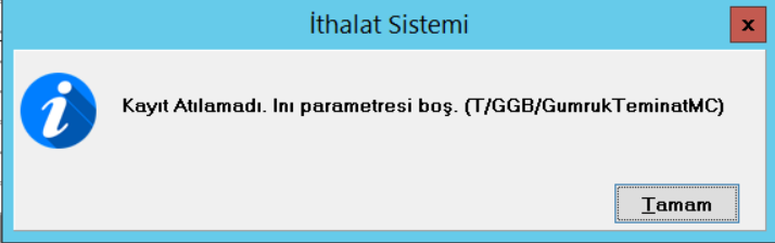 Kayıt Atılamadı. Inı parametresi boş. (T/GGB/Gumruk TeminatMC)