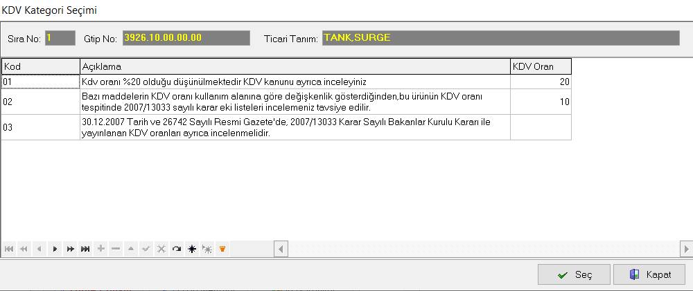 Örnek : 3926.10.00.00.00 Tarifede KDV Oranı 10 ve 20 seçilebilmektedir. Tarife çalıştırıldığında kategori seçim ekranında tarife için uygun olan gelmektedir. Bu tarife için %1 oran girilirse Gümrük %1 oranı kabul etmediği için hata gelmektedir.