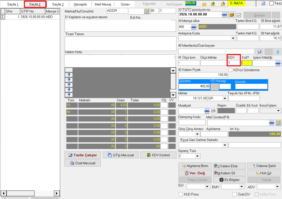3- İlgili tarifenin birden fazla kdv tipi olduğundan dolayı Kdv alanına 99 atmaktadır, ilgili tarifenin kdv mevzuatı incelenerek Kdv alanına girilmelidir.