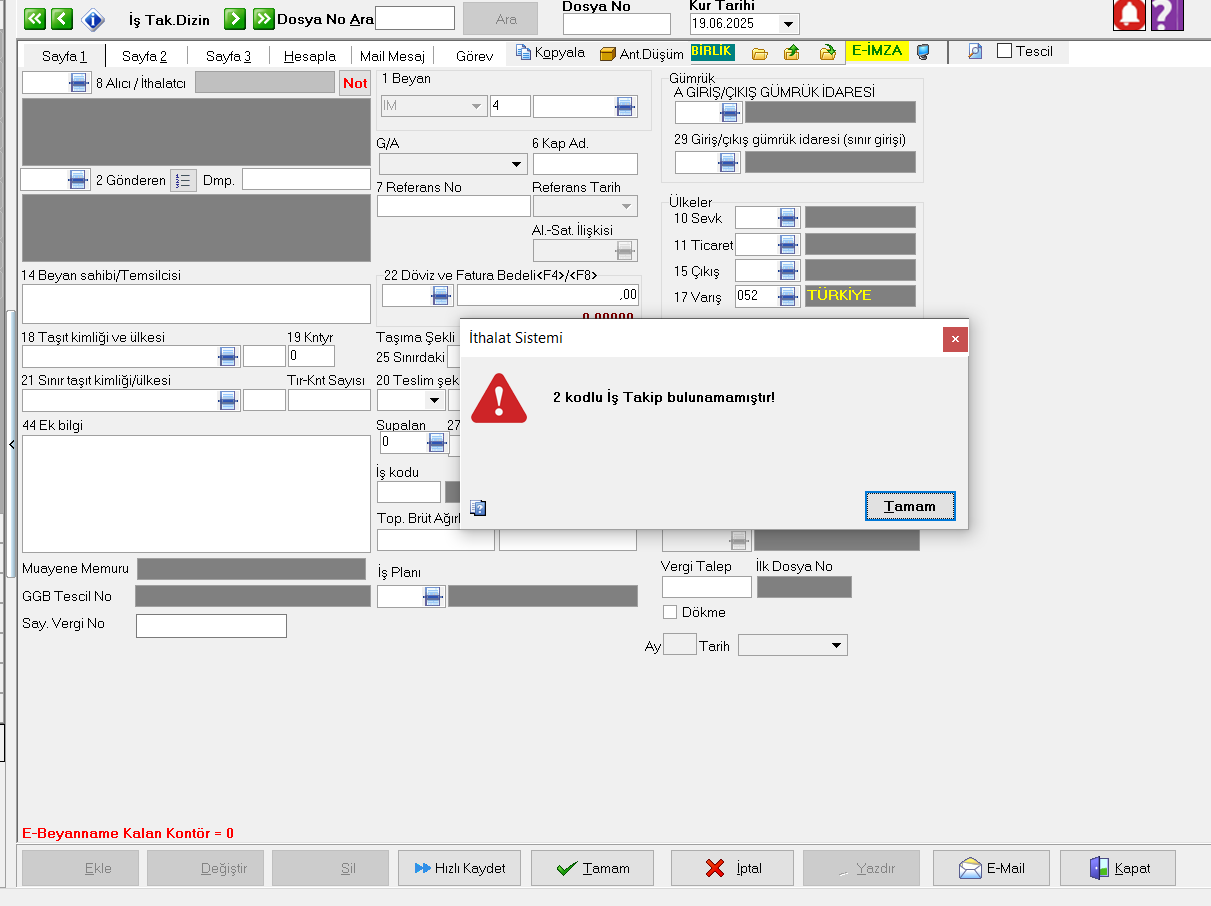 Beyannameye Eklerken gelen ** kodlu iş takip bulunamamıştır uyarısı Users > Sistem > Kullanıcı ekranındaki iş kodu alanındaki bilginin İthalat - İhracat Sistemi > Sistem > İş takip > İşlem kodu ekranında bulunmamasından ya da hatalı tanımlanmasından gelmektedir.
