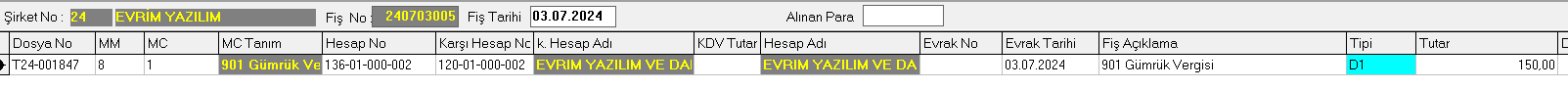 3-) Dosyanın masraf görüntüsü kontrol edildiğinde girilen hızlı masraf girişindeki tutardan farklı olduğu için sarı renk ile görünmektedir.
