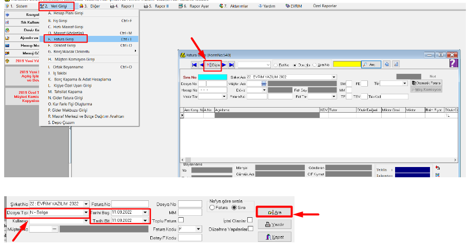 Ortak beyannamede N tipli dosyalar için kesilen faturaları görme; Muhasebe sisteminde Veri Girişi/ Fatura Girişi / Dizin alanına tıklanarak Dosya Tipi N seçilip ve Tarih Aralığı girilerek Ara butonuna tıklanarak sorgulanır.