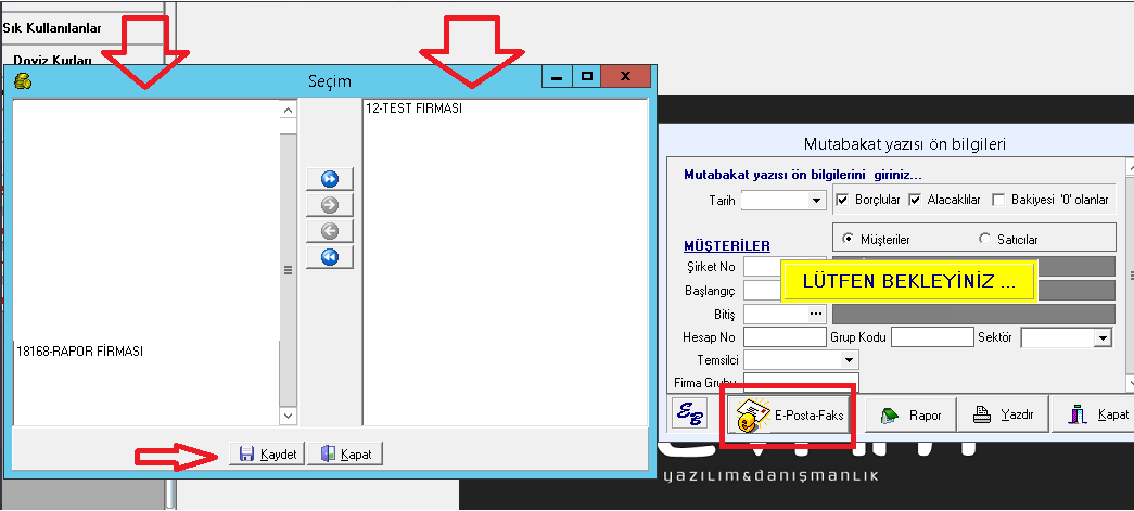 Mutabakat yazısı ekranında gerekli bilgiler doldurulduktan sonra E-Posta Faks butonuna tıklanarak gönderim işlemi başlatılır. Sistem verilen başlangıç ve bitiş numaralarına göre sistemde sorgu çekerek firmalardan borçlu alacaklı olanları ekrana getirir. Sonrasında ekranın sol tarafında yer alan firmalardan hangilerine mutabakat yazısı göndermek istiyor isek çift tıklayarak sağ tarafa göndeririz.