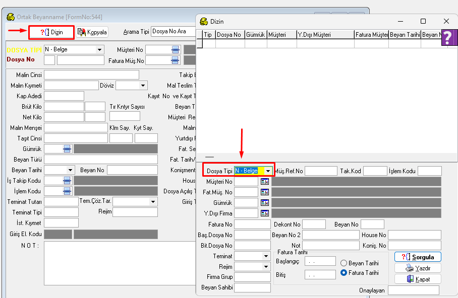 Ortak beyannamede N tipli dosyalar için kesilen faturaları görme; Muhasebe sisteminde Veri Girişi/ Fatura Girişi / Dizin alanına tıklanarak Dosya Tipi N seçilip ve Tarih Aralığı girilerek Ara butonuna tıklanarak sorgulanır.