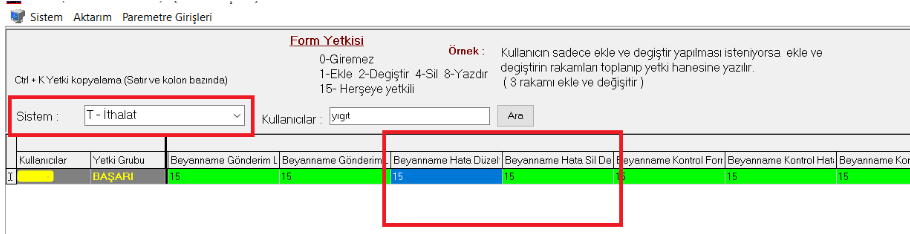 Not: Beyanname yazan kullanıcılara Hata düzeltme için 15 Hata sil değiştir yetkisi için 0 verilmesi sistemin kurgusu açısından daha uygun olacaktır.