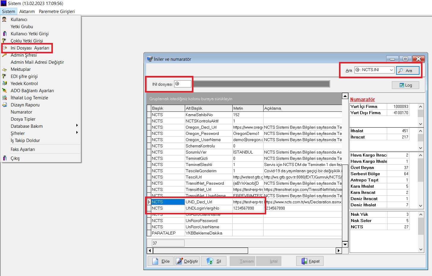 Aşağıda paylaşılan url adresi Users / Sistem / Inı Dosya Ayarları / Ncts Inı alanında Alt Başlık olarak UND_Decl_Url alanına tanımlanır. Firma vergi numaranız ise UNDLoginVergiNo alanına tanımlamanız gerekmektedir.