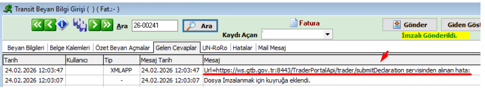NCTS Tescil Gönderiminde "Url=https://ws.gtb.gov.tr:8443/TraderPortalApi/trader/submitDeclaration servisinden alınan hata:" hatasını alıyorum ?
