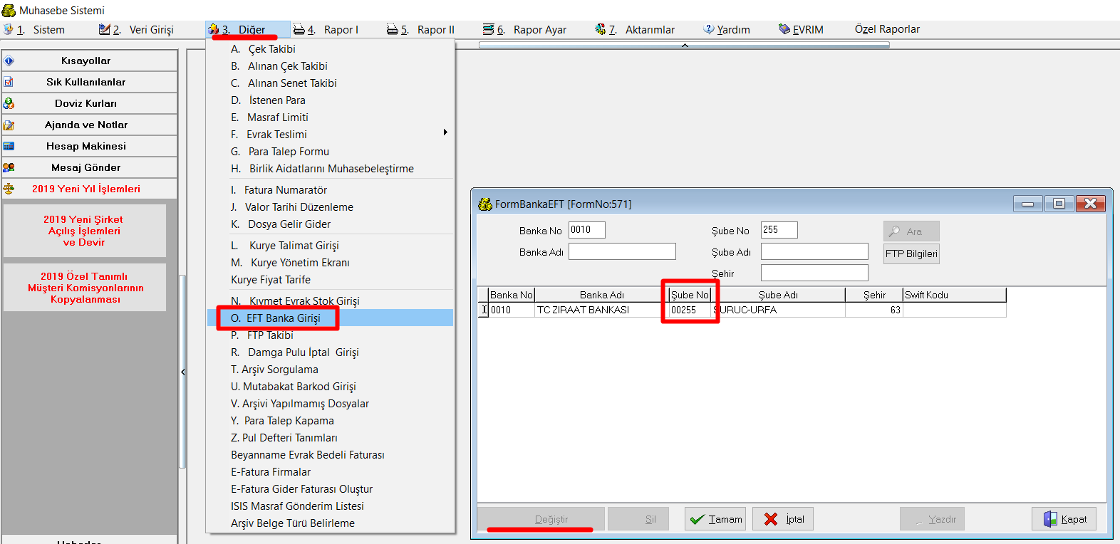 Değiştir butonuna tıkandıktan sonra düzeltme yapılıp Tamam butonu ile kaydedilmelidir.
