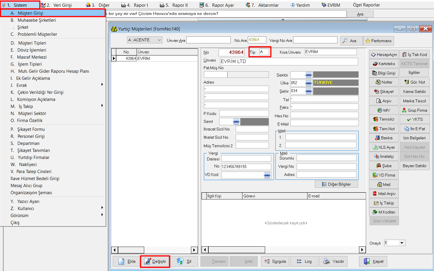 Muhasebe Sistemi > 1.Sistem > A.Müşteri Girişi ekranından ilgili firma çağrılıp