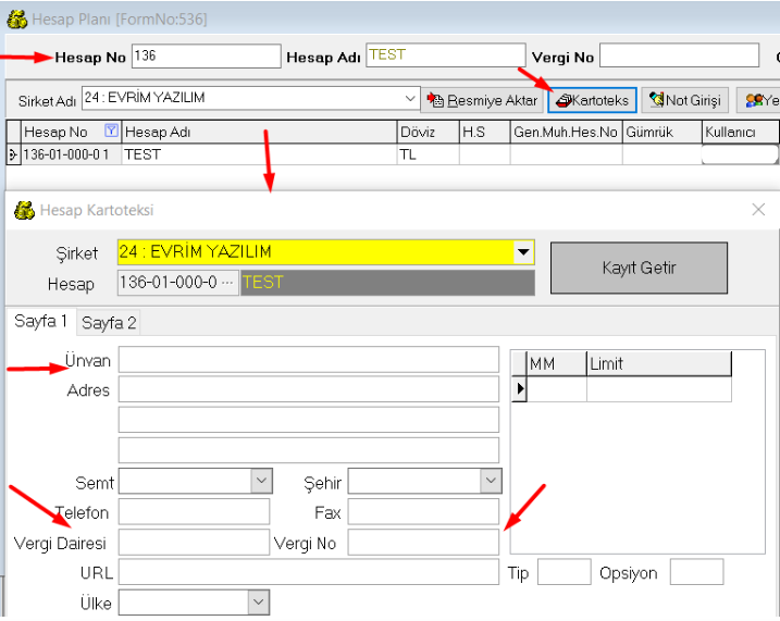 Muhasebe programı > 2. Veri Girişi > A.Hesap Planı Girişi alanlarından hesap planı girişine gitmelisiniz. Hesap planından ( para transfer ekranında ki alan hesap no da yazılan hesap ) ilgili hesabı bulun. Ardından, bu hesap üzerinde iken "Kartoteks" ...