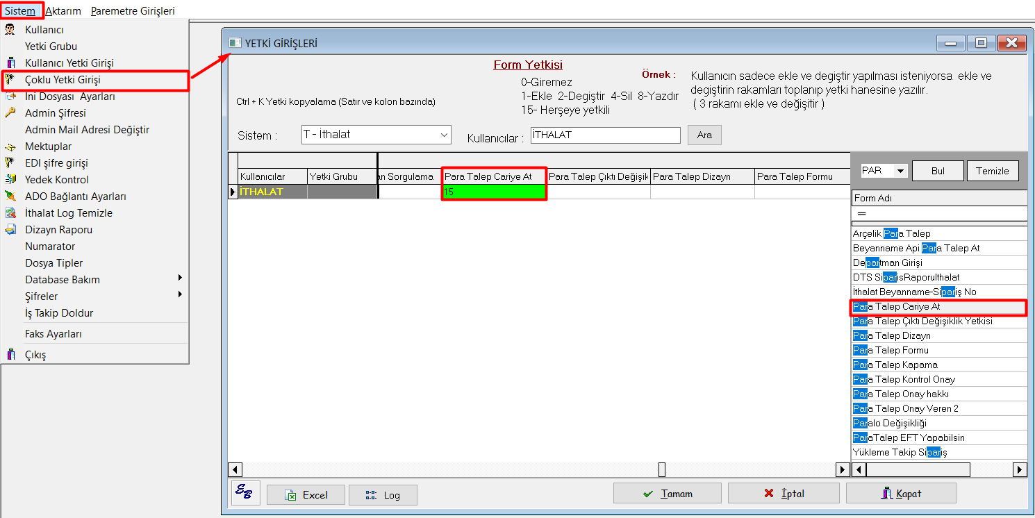 Kullanıcıya yetki tanımlamak için Users > Sistem > Çoklu Yetki Girişi > T-İthalat > H - İhracat > M-Muhasebe (Hangi modülde yetki verilmek isteniyorsa seçilmeli) > Para Talep Cariye At hanesi 15 yapılıp tamam butonuna tıklanarak kaydedilmelidir.