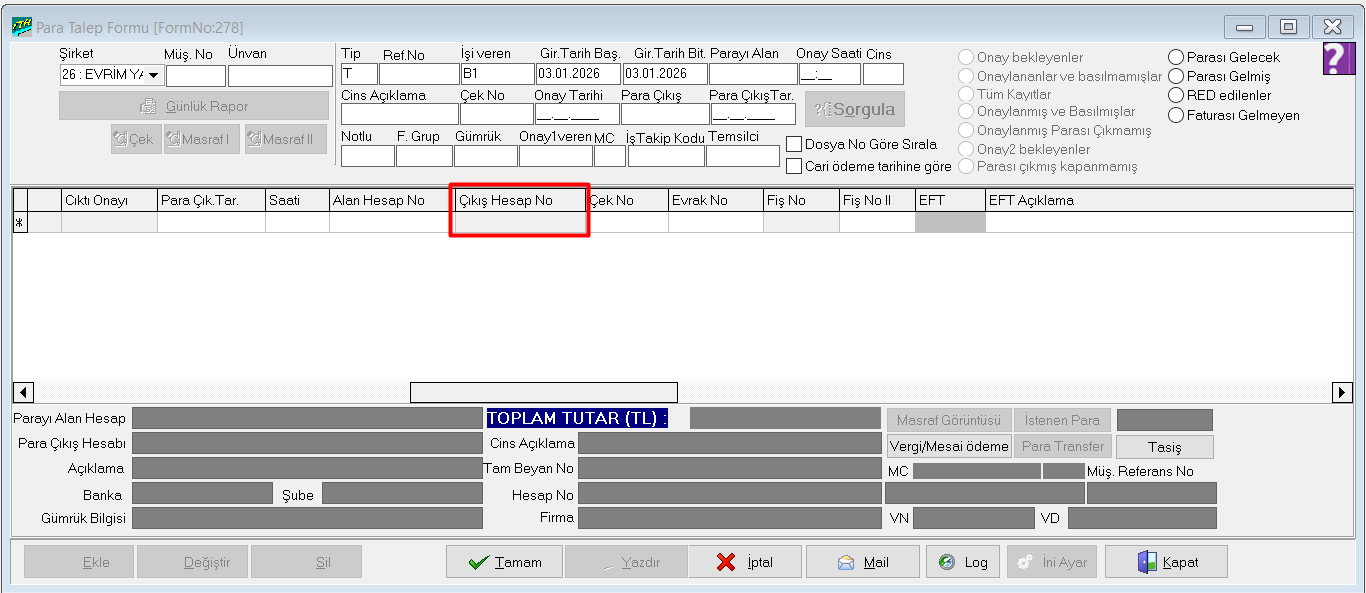Para Talep ekranında çıkış hesap no alanı pasif nasıl aktif edilir ?