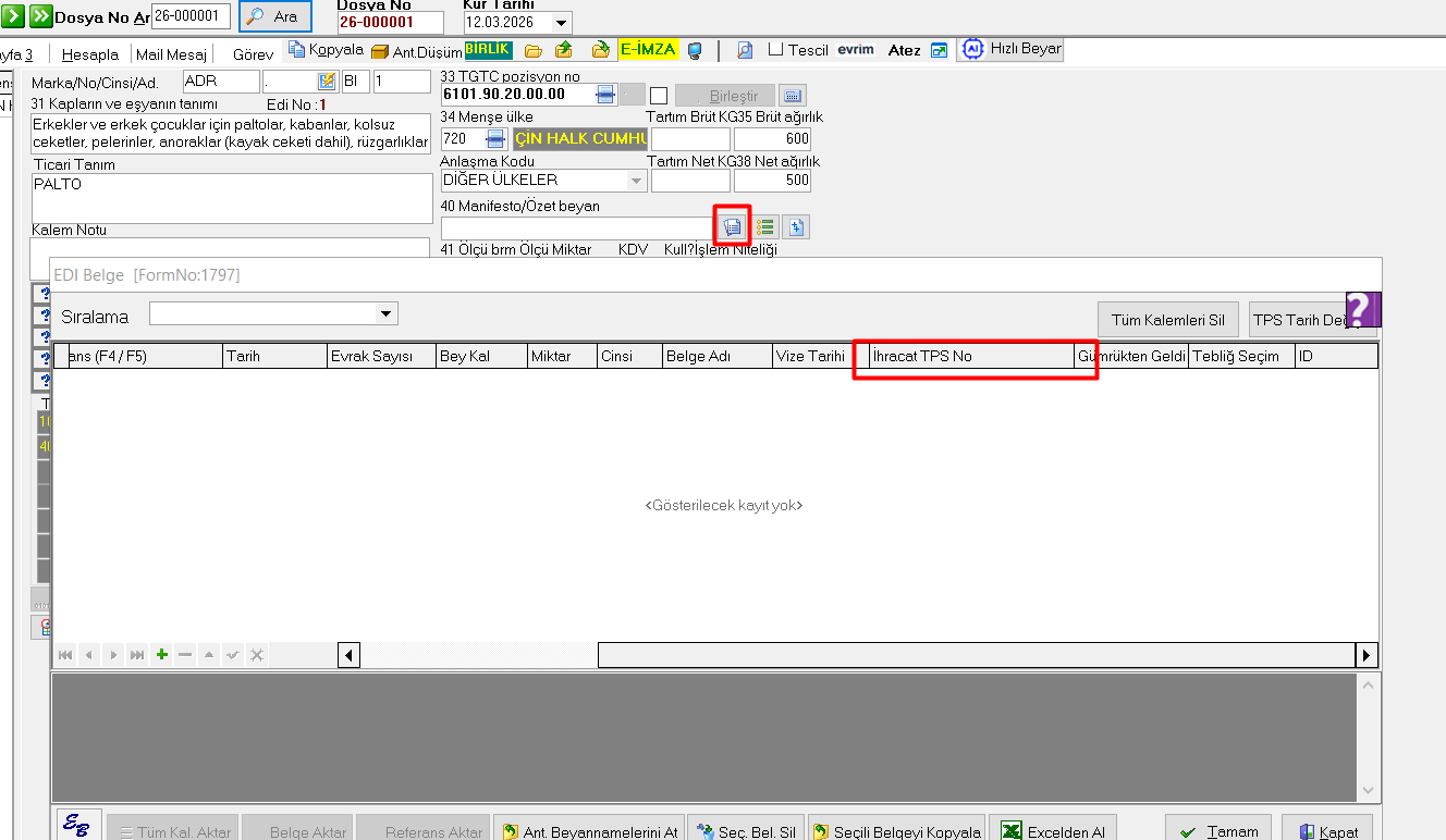 2. Veri Girişi > L. Süre Sonu İşlem Girişi alanında bulunan TPS NO alanına edi belge ekranında girmiş olduğunuz İHRACAT TPS NO verisinin gelmesi için ilgili İthalat Beyannamesinin Muafiyet alanında DIZIN muafiyeti olması gerekmektedir.