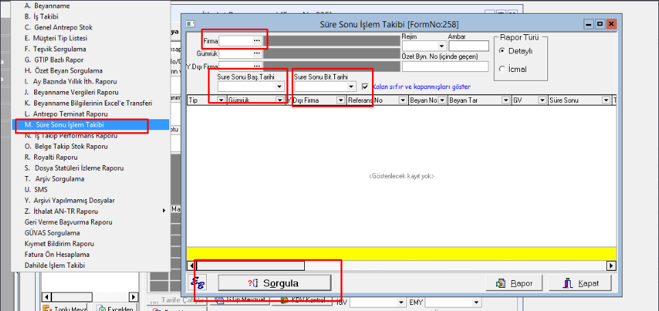 3 .Sorgulama/ M.Süre Sonu İşlem Takibi/ Süre sonu Başlangıç Tarihi - Süre Sonu Bitiş Tarihi girilerek sorgulama çekilebilir.