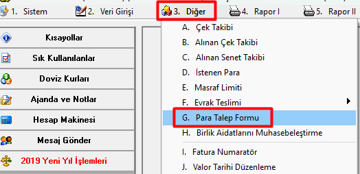 Muhasebe Sistemi için 3. Diğer > G. Para Talep Formu ekranlarından erişim sağlayabilirsiniz.