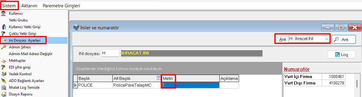 Evrim Haber > Diğer > Users > Sistem > Ini Dosya Ayarları > İhracat Ini > Alt Başlık PoliceParaTalepMC Metin alanına Muhasebe Sistemi > Evrak > Evraklar tablosunda kayıt atılacak MC kodu yazılmalıdır. Bu alana tek MC kodu yazılabilmektedir.