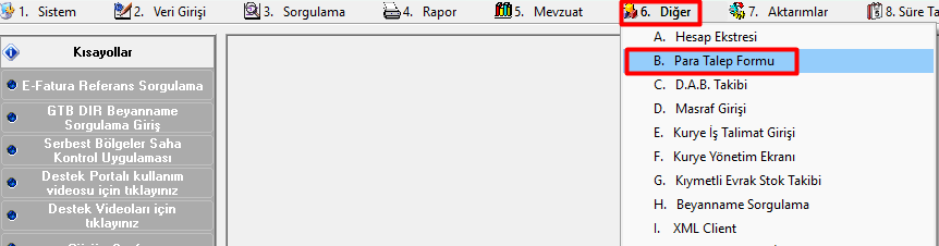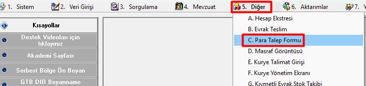 Dosyanıza ait para talep kaydına Diğer menüsünden ulaşabilirsiniz.