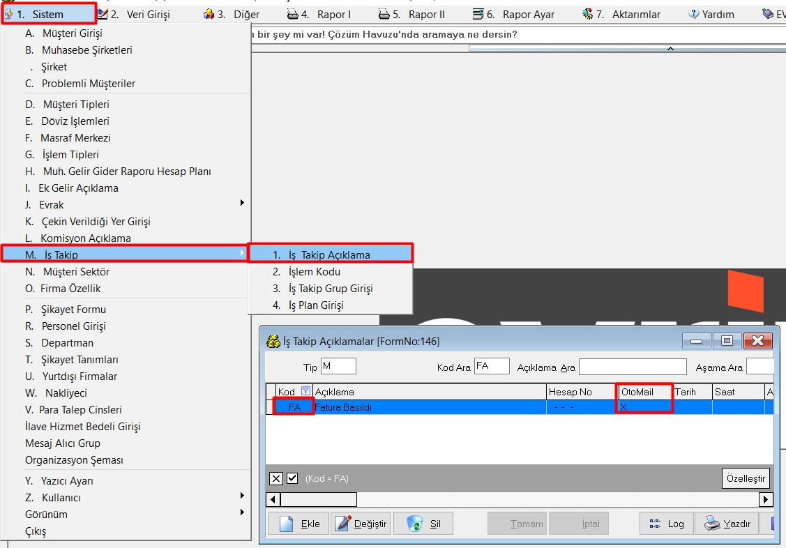 Örnek olarak '' FA '' İş takip kodunun girildiğinde mail gitmesi isteniyorsa Aşağıdaki adımlar sırayla yapılmalıdır.
