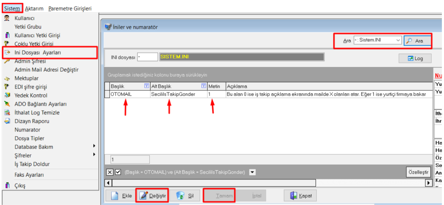 Evrim Haber > Diğer > Users > Sistem > Inı Dosyası Ayarları > - : Sistem.INI - OTOMAIL - SecilisTakipGonder ekranında Değiştir butonuna tıklanarak Metin alanına '' 1 '' yazılıp Tamam butonu ile kaydedilmelidir.